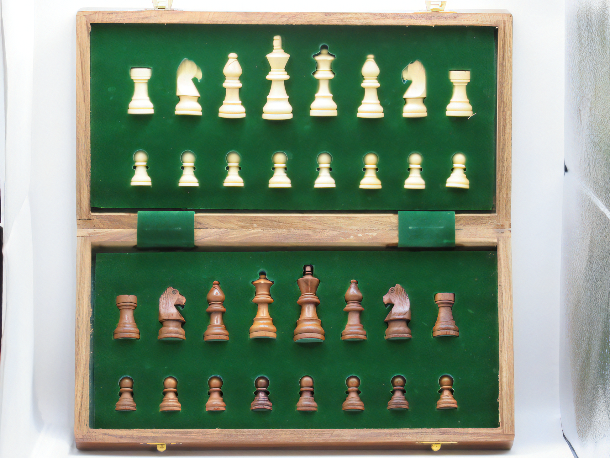 - Complete set of carved wooden chess pieces in two contrasting colors